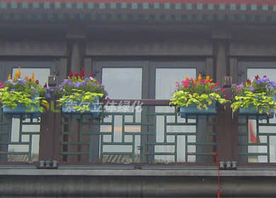 陽臺花園護欄雙面掛,利用兩只立體鞍式綠化箱SL-XA5060、三層立體鞍式綠化箱SL-XA6533,配以花草加灌溉系統,固定于護欄欄桿,形成立體景觀效果。